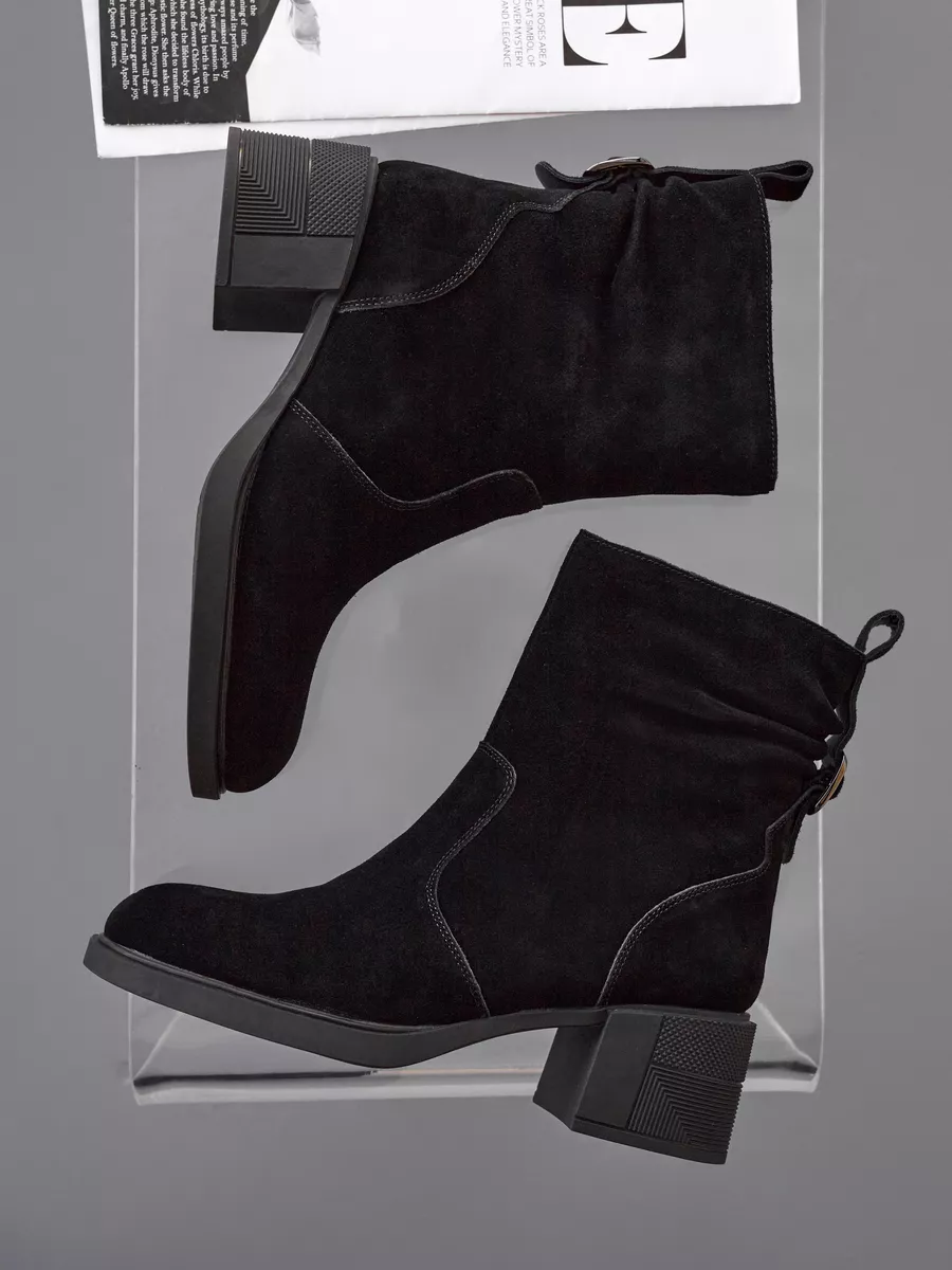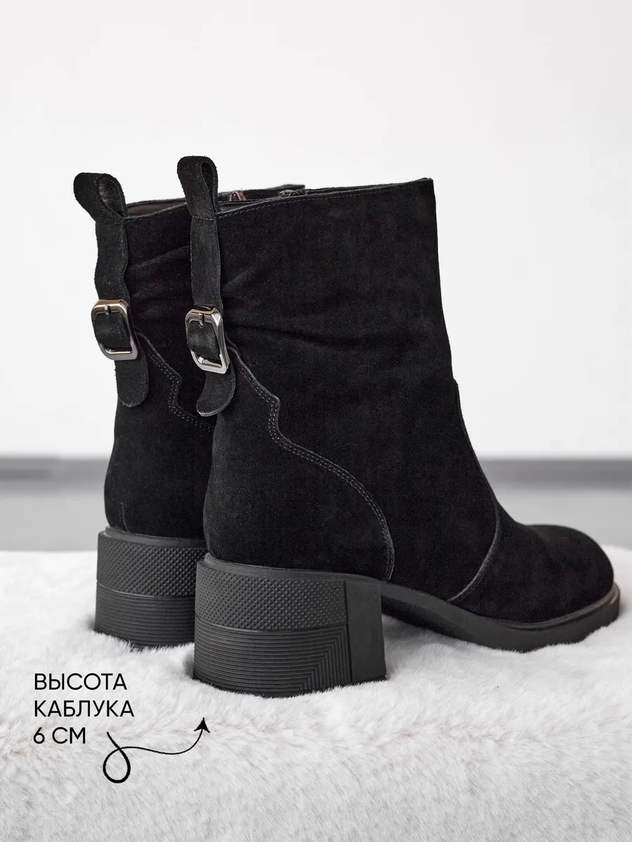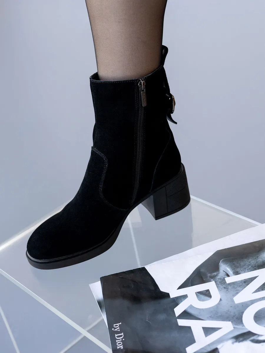 Ботильоны на каблуке выполнены из натуральной замши и дополнены вставками, придающими модели современный и стильный вид. Каблук средней высоты обеспечивает женственность и элегантность, а удобная колодка позволяет носить обувь в течение всего дня без ощущения усталости. Черные ботильоны прекрасно сочетаются с различными нарядами, будь то офисные образы или более повседневные варианты. Это универсальная зимняя обувь, которая гармонично впишется в любой гардероб.