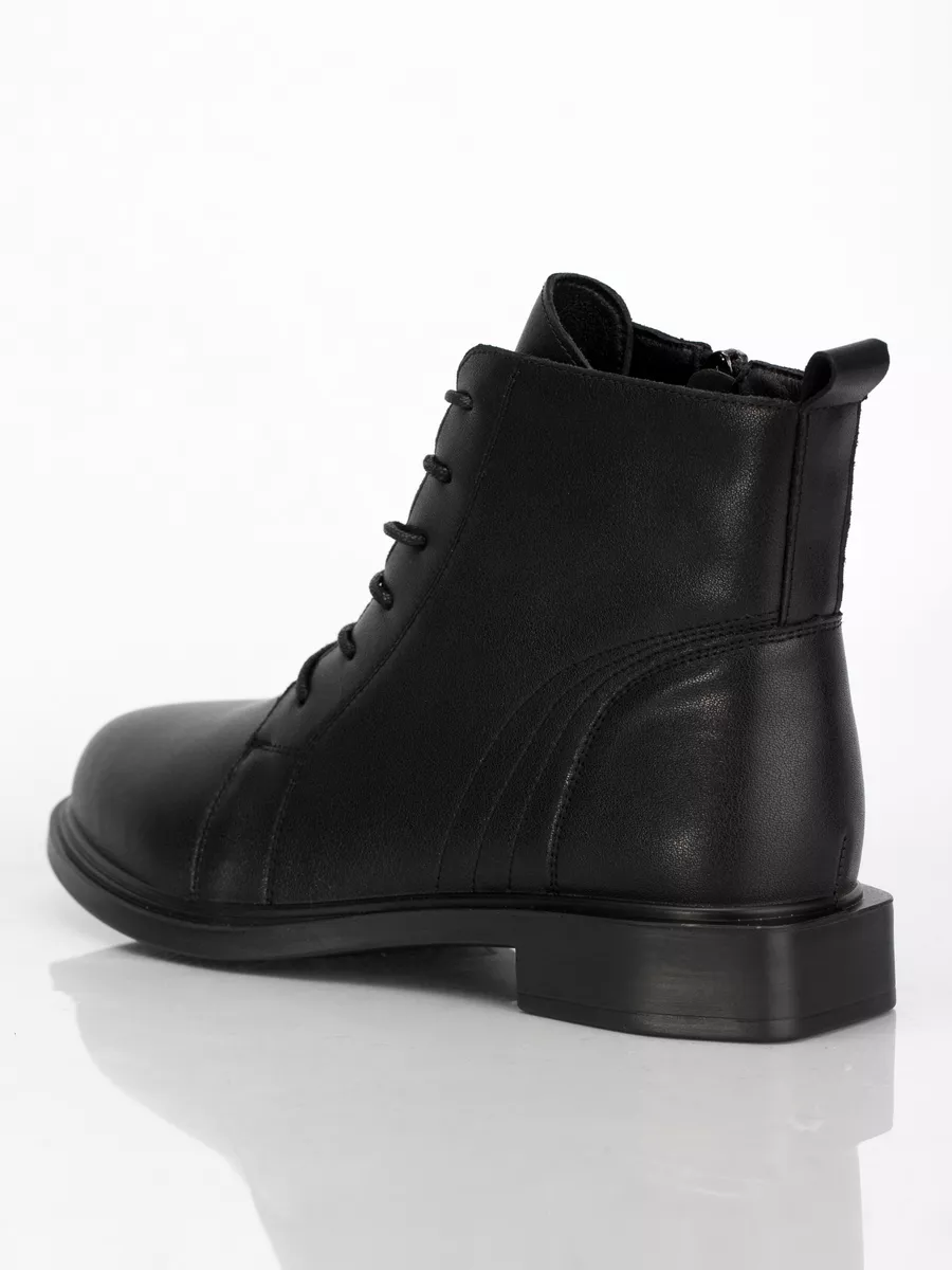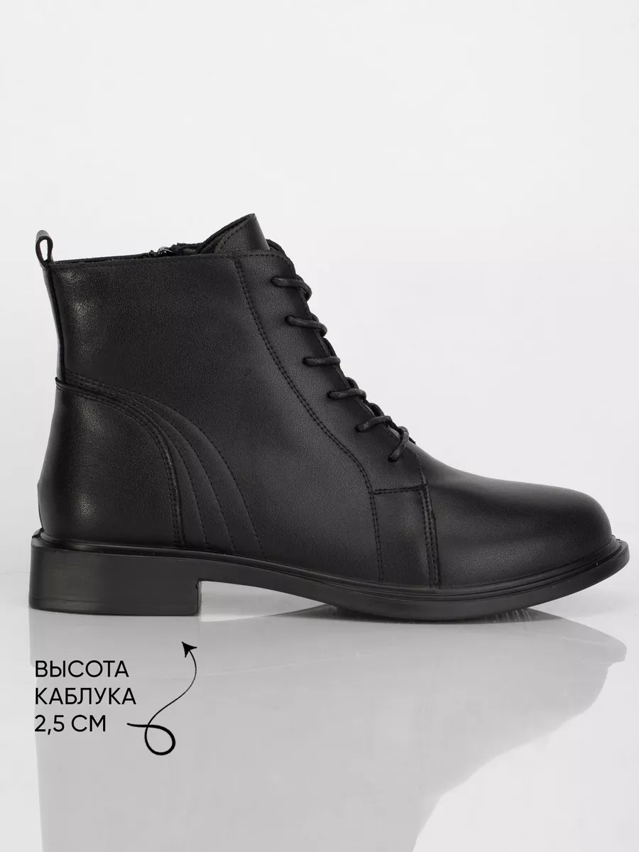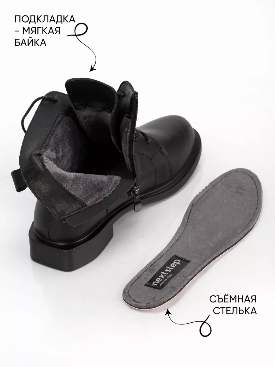 Ботинки идут размер в размер, длина стельки в 38 размере 24,5 см, длина стельки увеличивается на 0,5 см с увеличением размера. Модель хорошо подойдёт на среднюю и полную стопу. Кожаные ботинки на массивной подошве из ПУ (Полиуретан). Толщина подошвы выше 1см, чтобы стопа не ощущала дискомфорт от неровности поверхностей. Кожаные ботинки эластичные, прочные, долговечные, они хорошо пропускают воздух и не позволяют стопе потеть, создавая комфортные условия на весь день. Ботинки застёгиваются на молнию и обеспечивают идеальную посадку, которую легко отрегулировать с помощью шнуровки. Материал подкладки - натуральная байка. Подкладка из натуральной байки обеспечивает дополнительный комфорт Вашим ногам, ощущение мягкости. Материал дышит и сохраняет тепло.