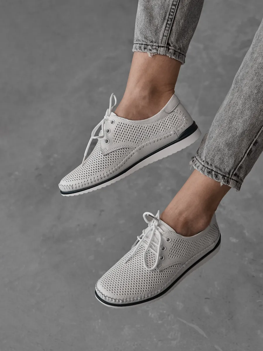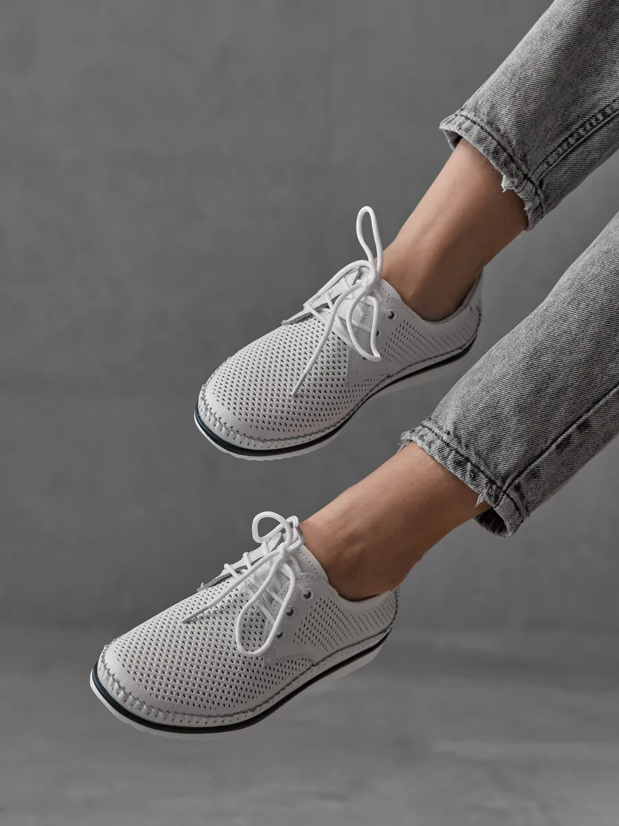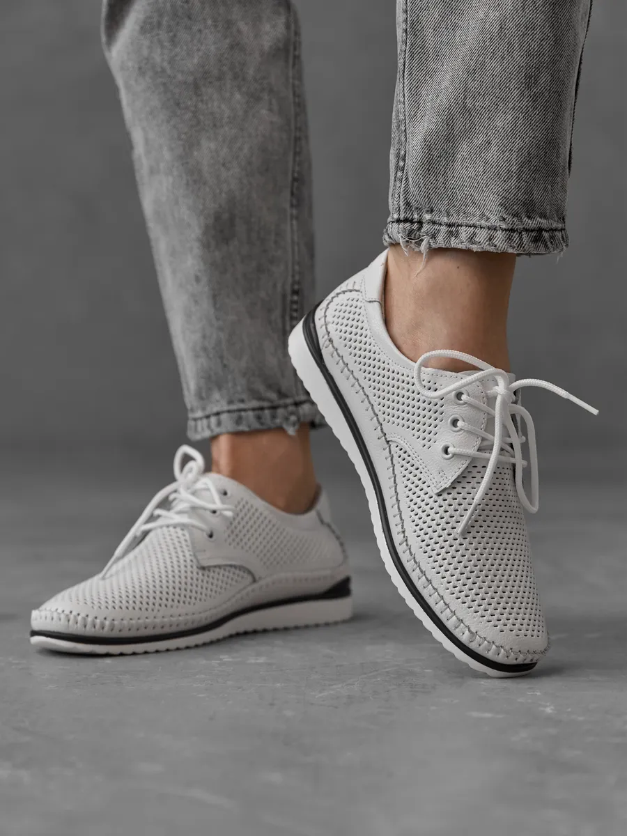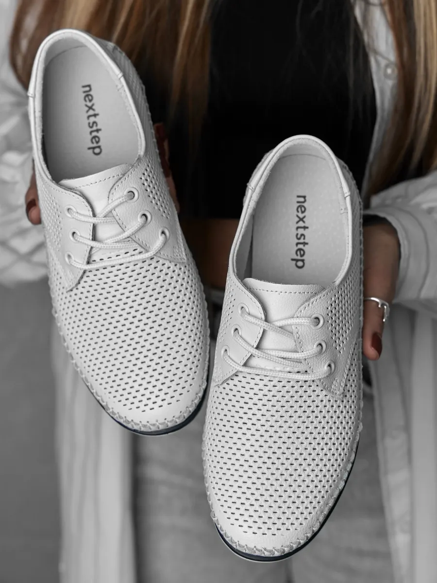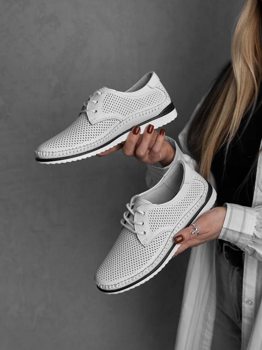 Эти мокасины легко вписываются в любой гардероб благодаря универсальному дизайну. Они подходят для повседневной носки, работы, прогулок или даже праздничных мероприятий. Нейтральный белый цвет позволяет комбинировать их с повседневной одеждой, летними платьями или деловыми костюмами. Дышащие вставки с перфорацией обеспечивают циркуляцию воздуха, создавая комфортный микроклимат для ног. Эти кожаные мокасины идеально вписываются в современный городской стиль. Их классический дизайн в сочетании с модными элементами делает их актуальными для девушек, женщин любого возраста и медицинских работников. Лёгкость и стильный внешний вид подчеркивают изысканность вашего образа, будь то весенняя прогулка или летний ужин.