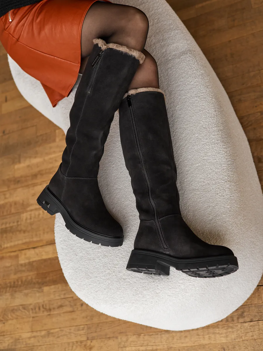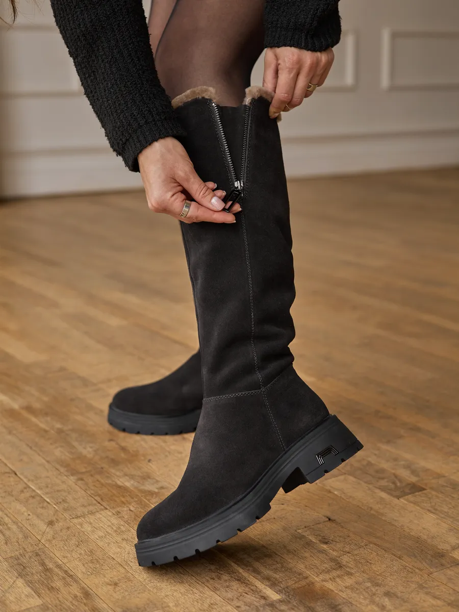 Сапоги выполненные из высококачественной натуральной замши обеспечивают долговечность и комфорт. Длинные сапоги с функциональной молнией на верхней части голенища позволяют увеличить обхват примерно на 4,5 см. Подкладка и съемная стелька из натуральной шерсти гарантирует тепло ваших ног в сильные морозы. Тракторная подошва позволит чувствовать себя устойчиво на скользкой поверхности.